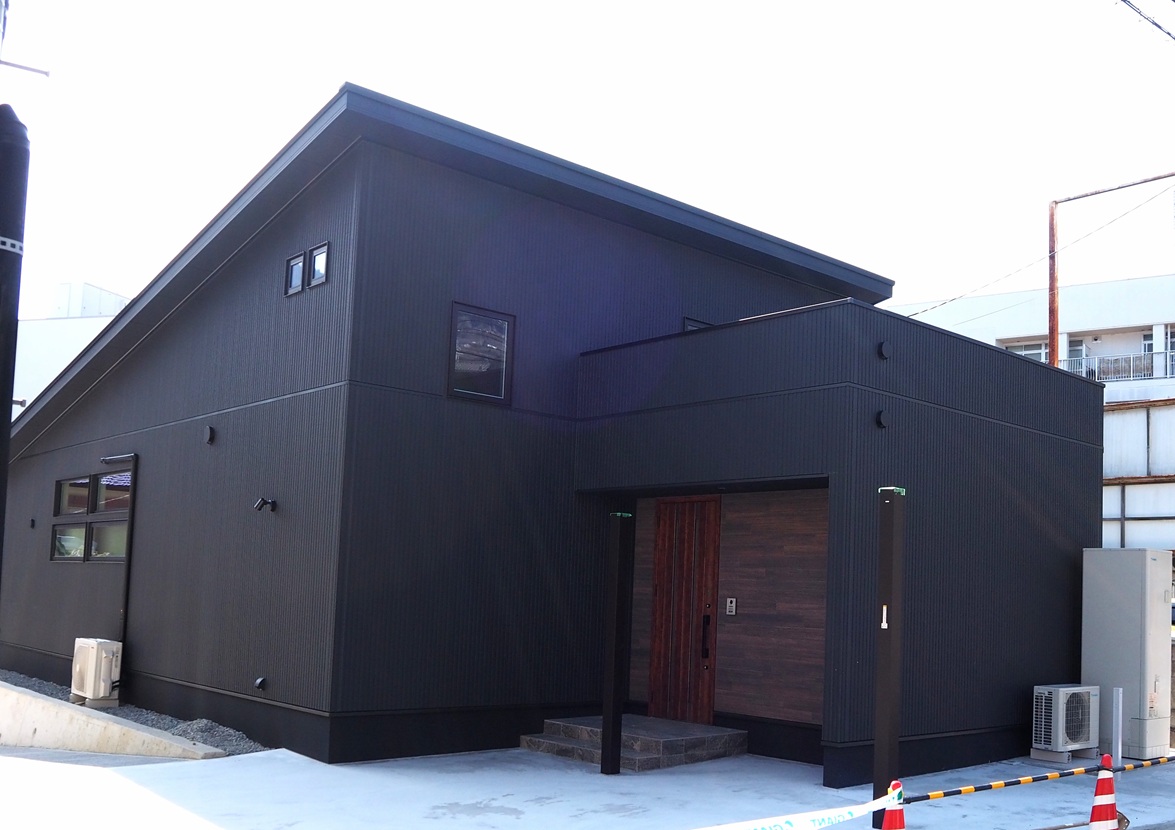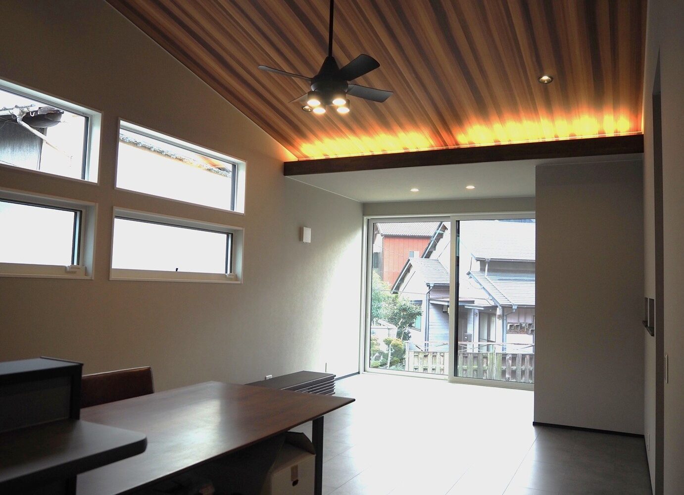 工事概要 | 平屋建ての特性を生かした 吹き抜けやロフト部屋のある、かっこいい平屋住宅です。 平屋の特徴を生かした斜め天井のリビング |